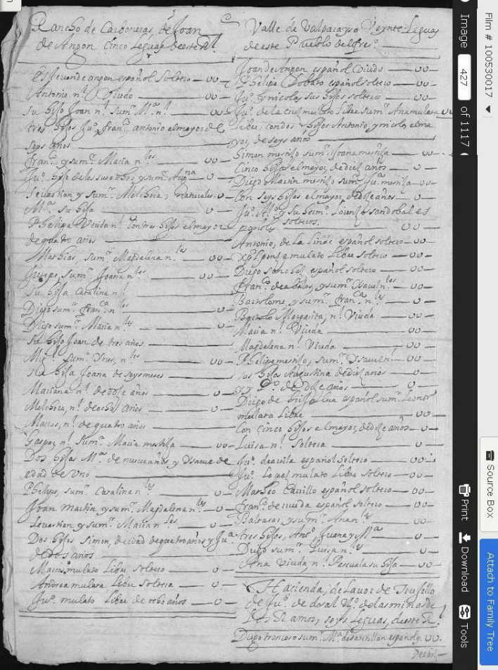 Attached is the census. Can someone help me on my ancestors "Joan Angon" who is listed first on the list of the Valparaiso Census in regards to why is he listed as first on the list and did he own a ranch right there?